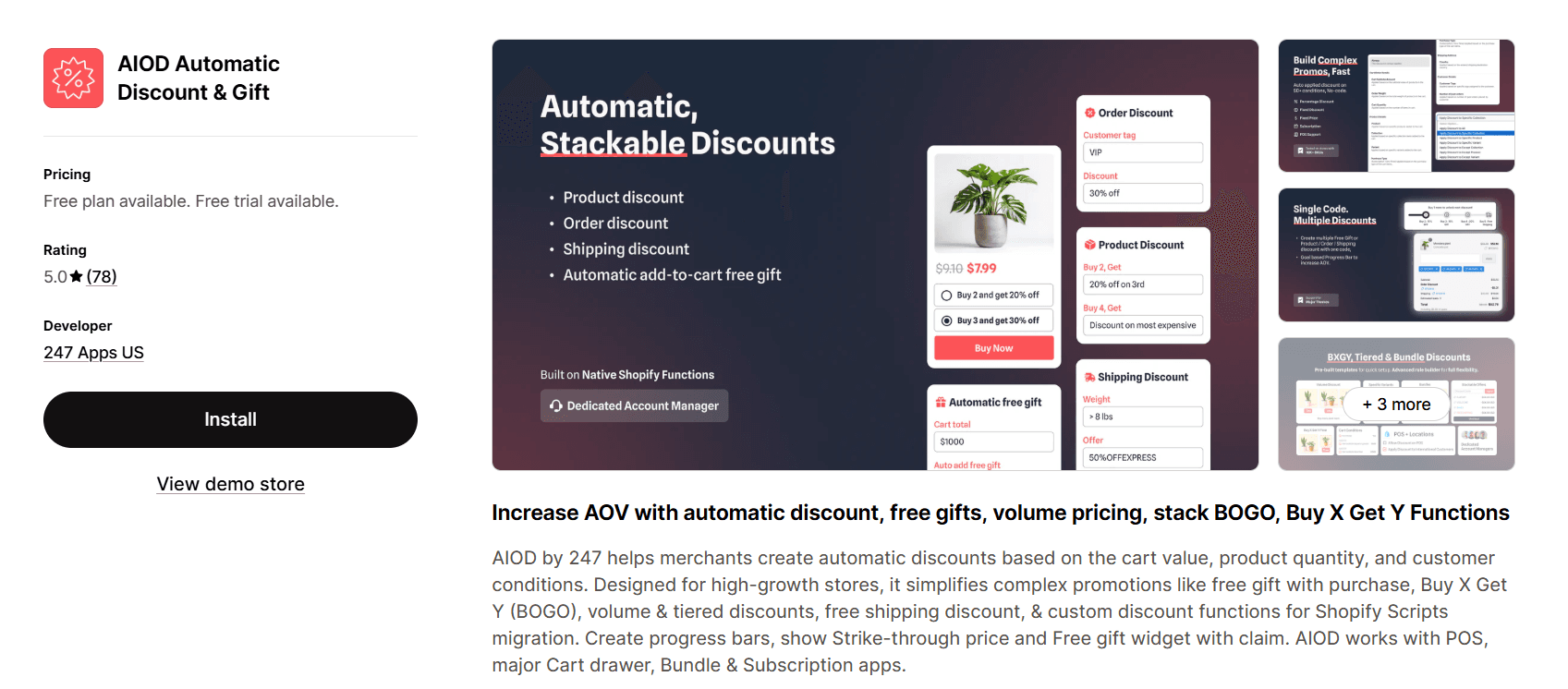 AIOD – Automatic Discounts | 5.0⭐(78) | Multiple discount types + stacking; Auto add-to-cart (BOGO, free gifts); High stability for large campaigns | $9.99–$24.99/month | Complex discount strategies; high-volume stores |