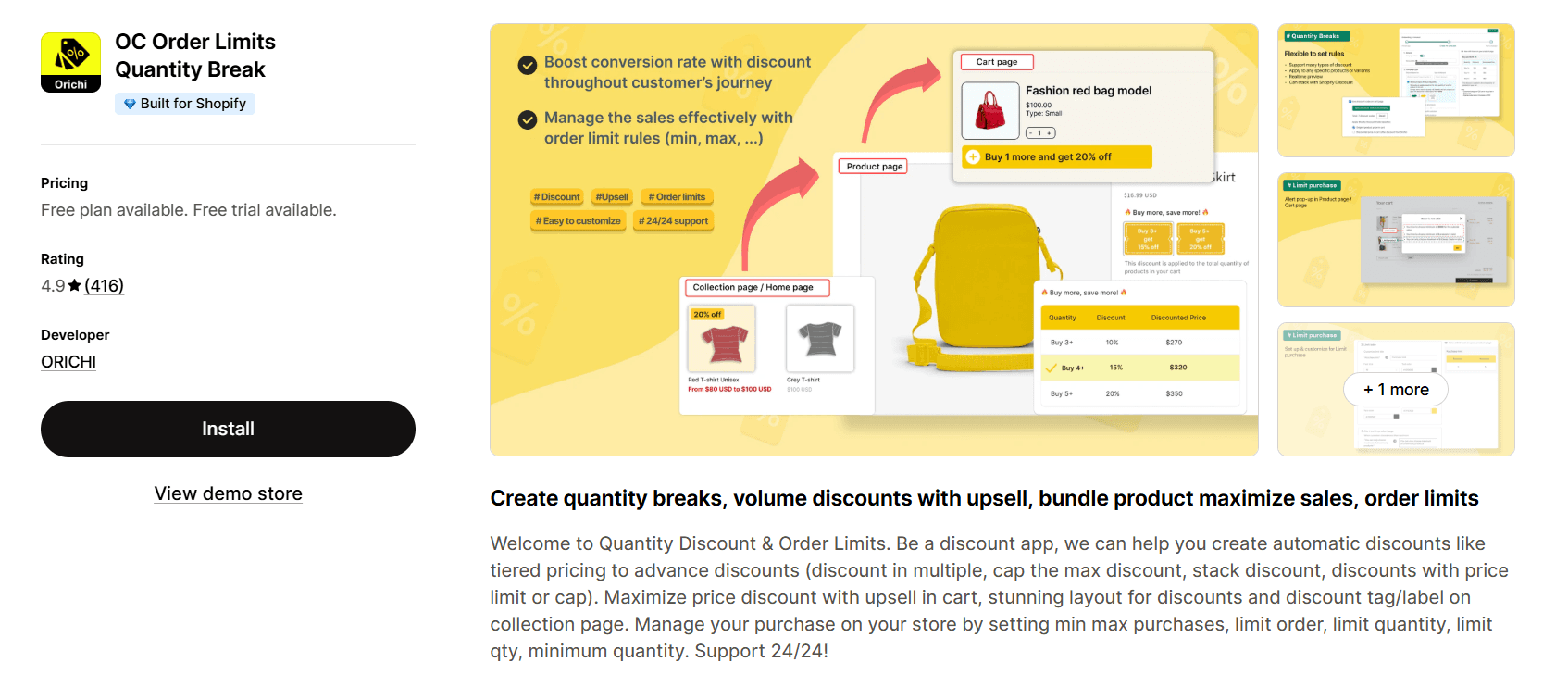OC Quantity Breaks | 4.9⭐(416) | Tiered pricing + volume discounts; Order limits (MOQ, cart, product); Cart upsell support | Free–$20/month | Stores needing pricing control + purchase limits |