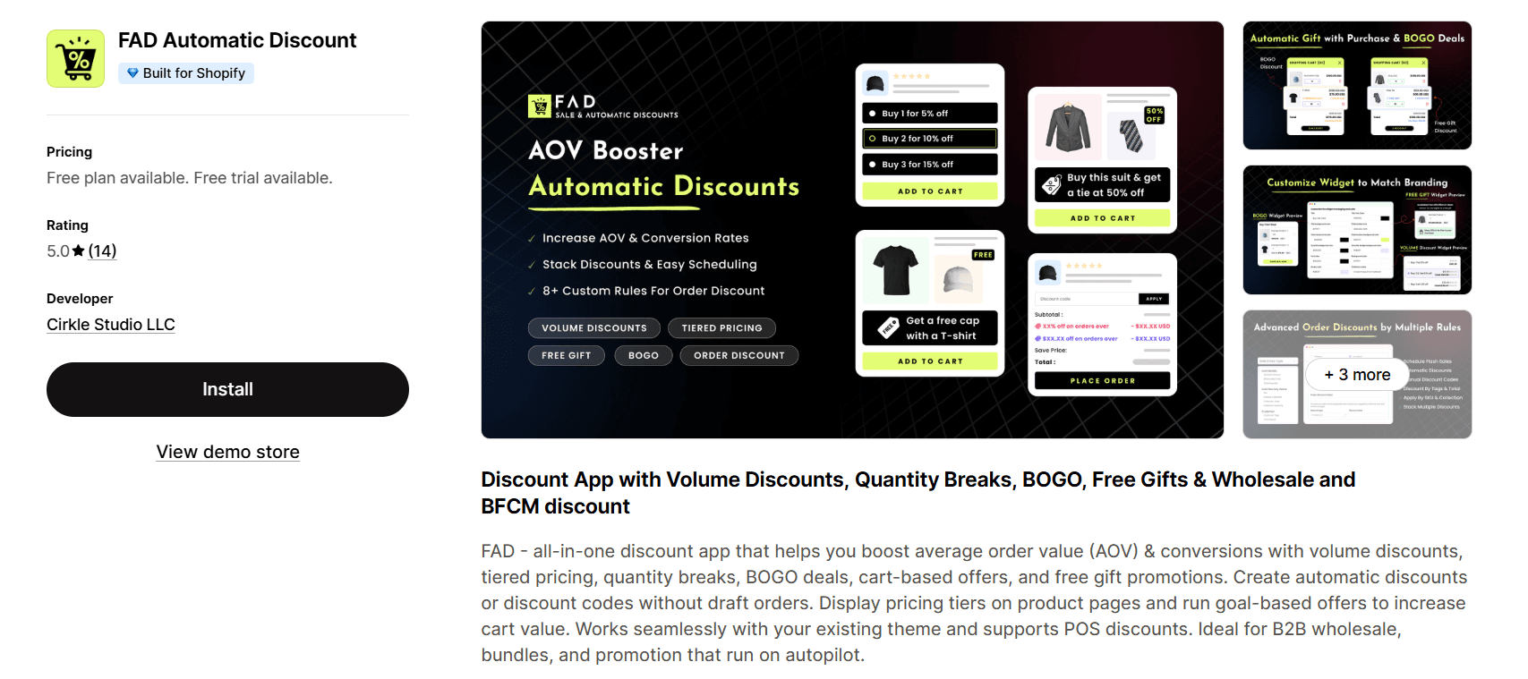 FAD is built for merchants who prioritize Shopify volume discount apps to move inventory quickly. It is an all-in-one automatic discount app built to increase AOV using volume discounts, tiered pricing, BOGO, and free gift offers. It supports both automatic discounts and discount codes without disrupting Shopify’s native checkout flow, making it reliable for continuous promotions.