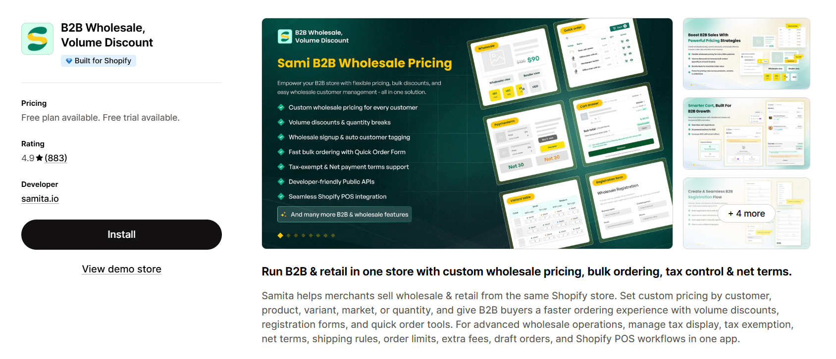 B2B Wholesale (Samita) | 4.9⭐(883) | Customer-specific pricing (tags, variants); Bulk ordering + volume discounts; Tax, net terms, and order controls | Free–$49.90/month | Wholesale + retail in one store; B2B workflows |