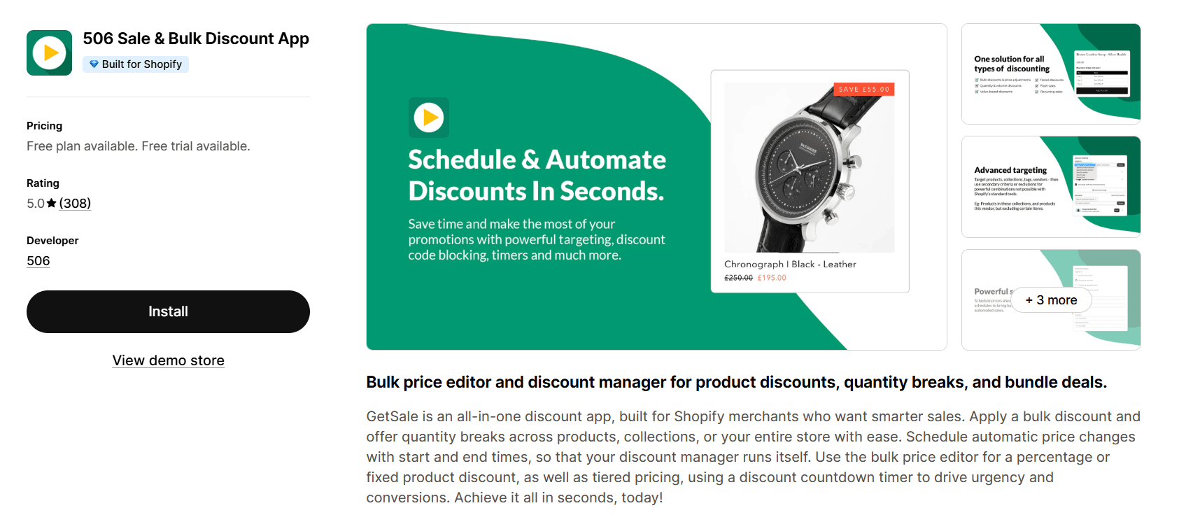 GetSale Bulk Discounts | 5.0⭐(308) | Bulk price editor (storewide control); Scheduled discounts with auto-revert; Tiered pricing + multi-campaign support | Free–$29.99/month | Large catalogs; seasonal or sitewide sales |