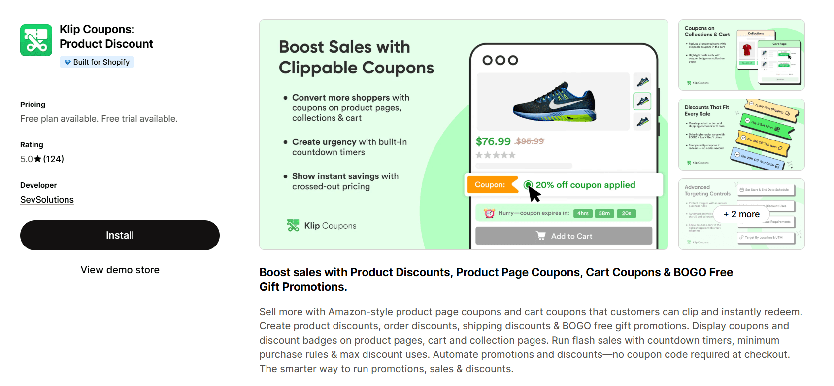 Klip Coupons | 5.0⭐(124) | Clippable product & cart coupons; On-page badges + countdown timers; No-code discount application | Free–$59.99/month | UX-driven promotions; product page conversions |