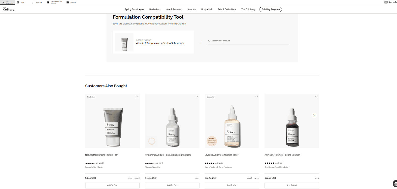 For example, when a customer searches for a serum on The Ordinary, it features a “Customers Also Bought” section that includes a toner, a moisturizer, a peeling solution, and hyaluronic acid as other steps in the skincare routine.