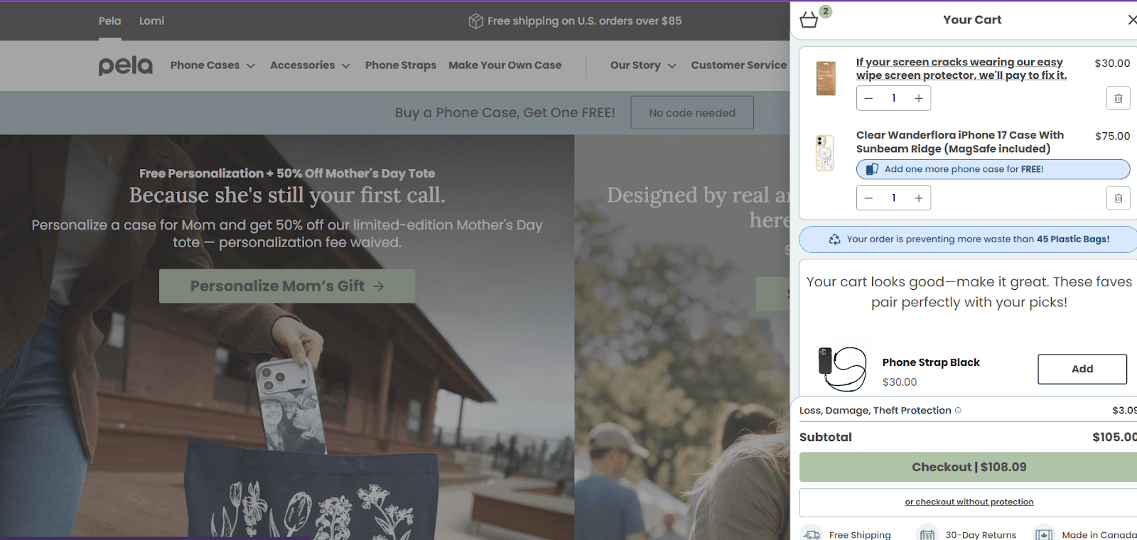 For example, Pela, a phone case Shopify store, adds a phone strap option in just one click on the cart page when the customer buys a phone case. It is the last moment, yet it is utterly convincing.