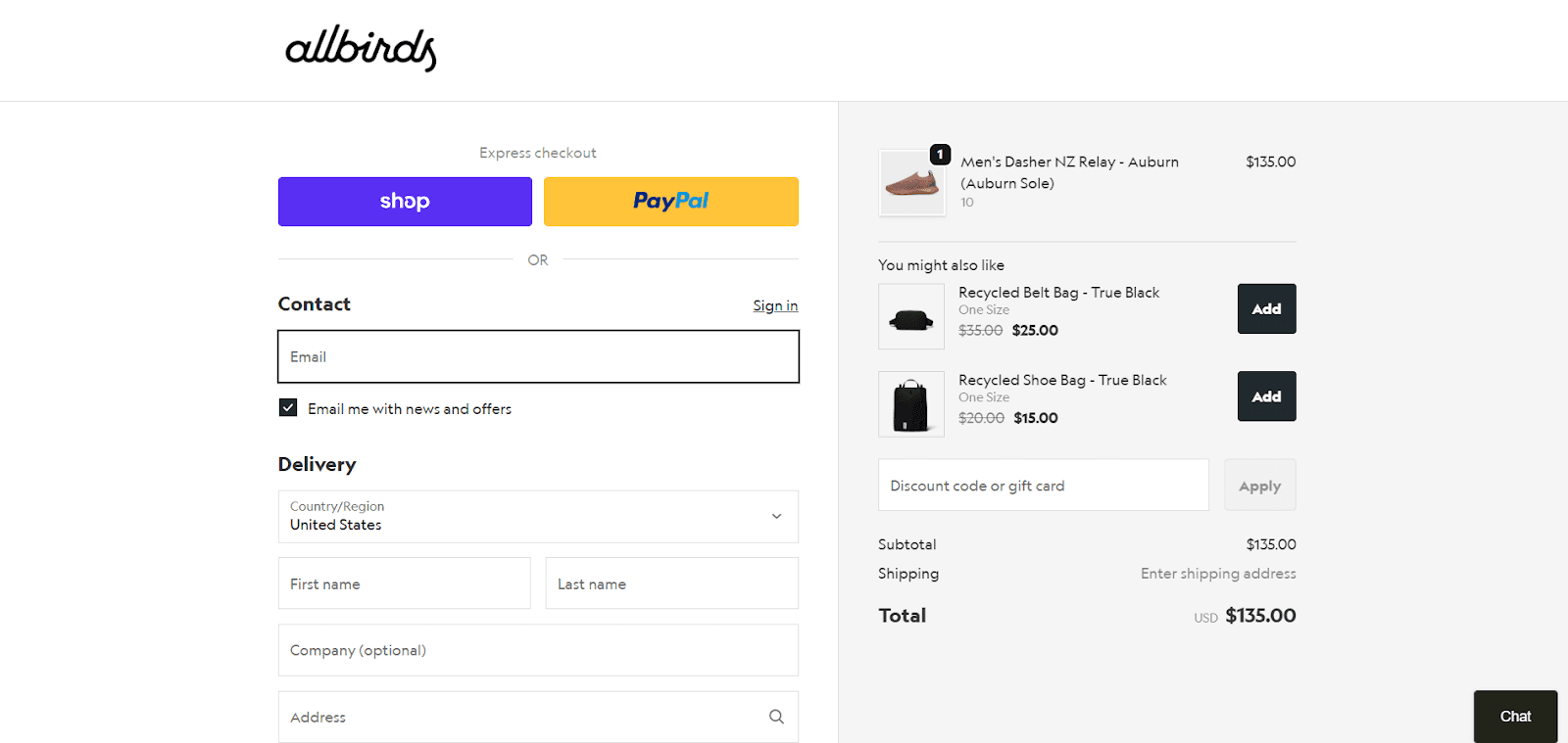 For example, Allbirds offers cross-sells such as a shoe bag when a customer is buying a pair of shoes. A shoe bag doesn’t require much consideration, but it is also necessary, which makes it the perfect spot.