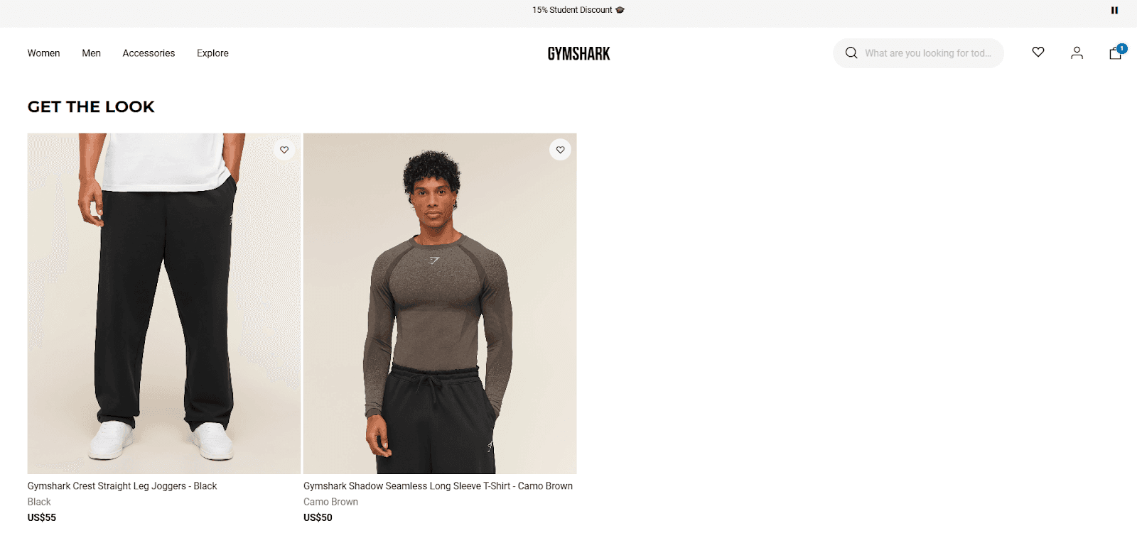 For example, Gymshark, an apparel brand, features a “Get The Look” section when a customer purchases a t-shirt. It provides a matching set of joggers to pitch a complete look to the customer.