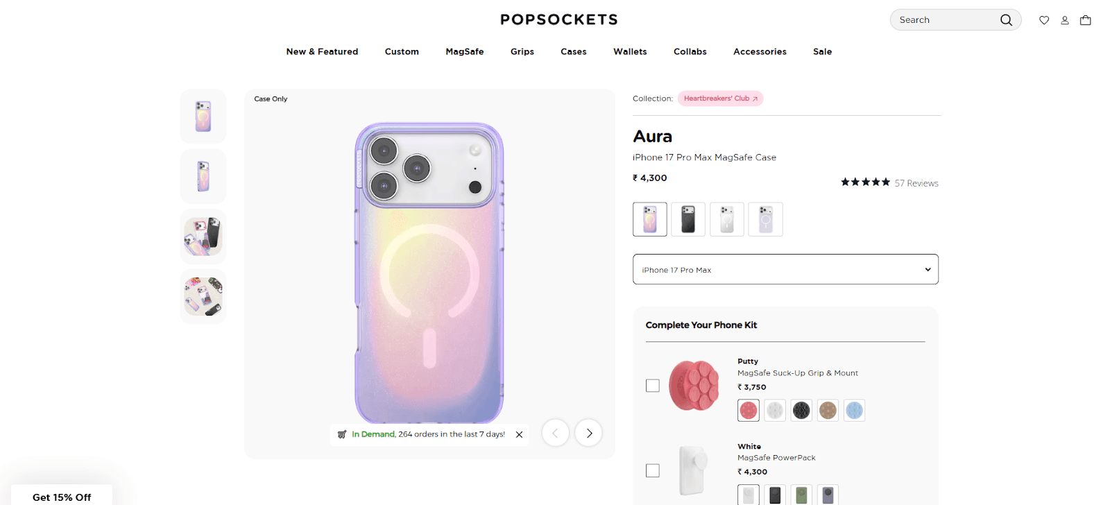 For example, Popsockets has a section that features products that help “Complete Your Phone Kit.” Along with a phone case, it offers a MagSafe Power Pack or a mount, making the purchase complete.