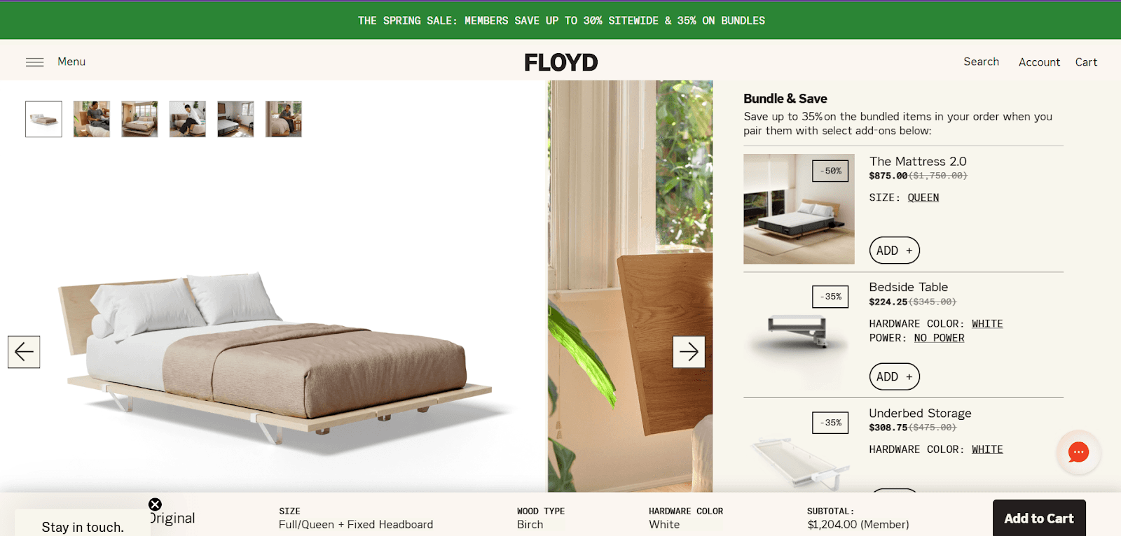 For example, Floyd provides its viewers with relevant furniture that complements the main product they are buying. In this case, when a customer is looking up a bed, they see bundling options of a mattress, beside table, and under storage.