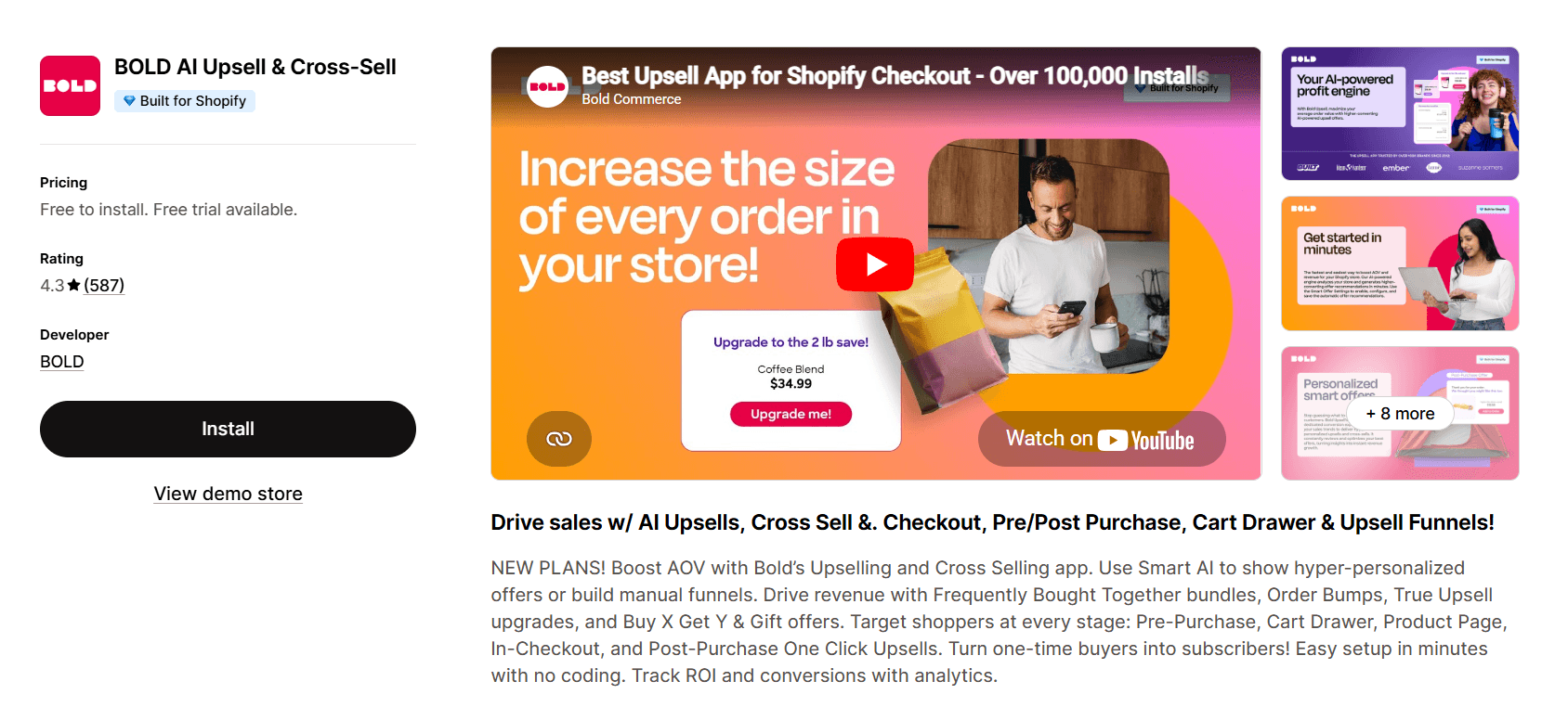 Bold Upsell leans heavily on AI to decide which products to show and when, analyzing customer behavior and preferences to serve offers that are more likely to convert. You can place upsells on product pages, in the cart, at checkout, after purchase, and even via email.