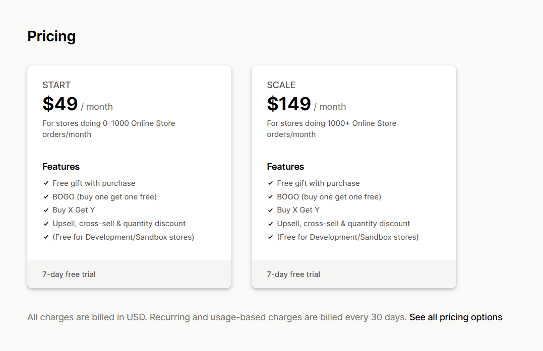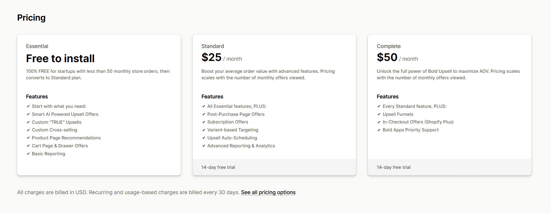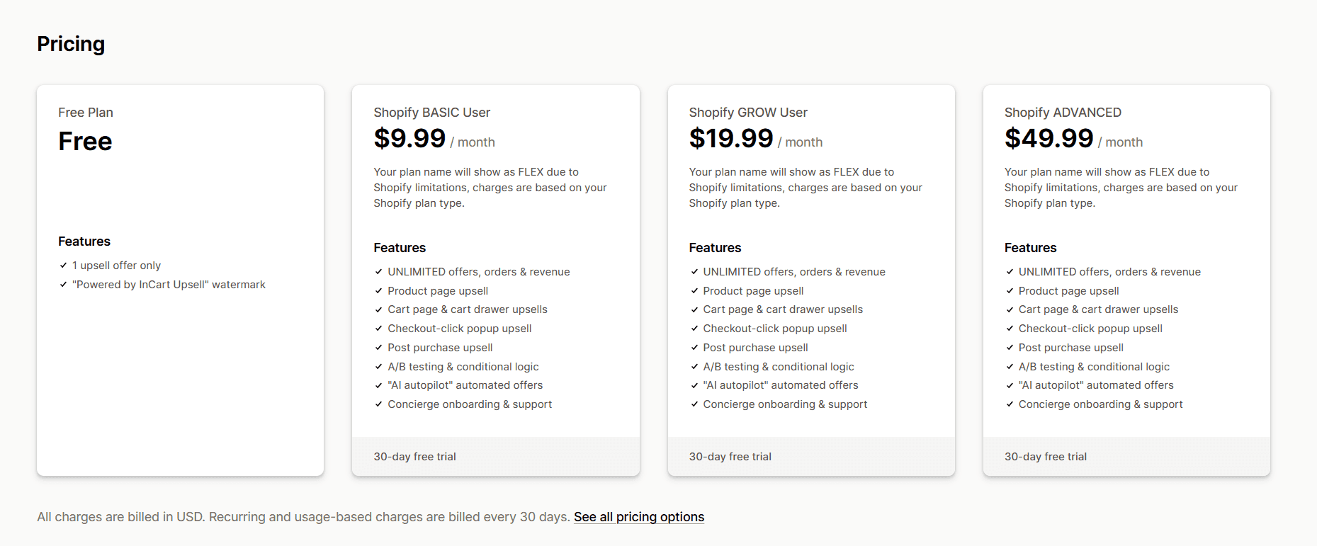 Free plan available (1 upsell per month). Paid plans range from $9.99/month to $99.99/month, depending on your Shopify plan, with a 30-day free trial.