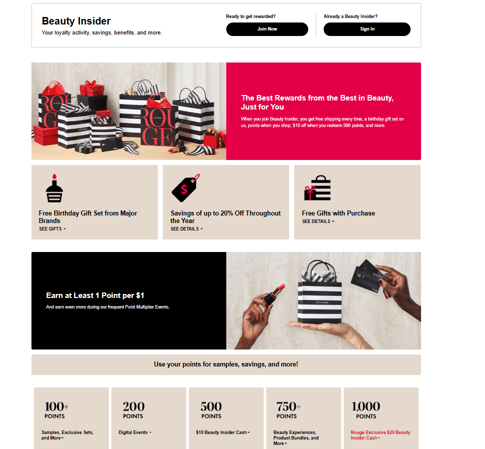 For example, Sephora's Beauty Insider program has a three-tier loyalty system in which customers earn points across multiple touchpoints, and those points provide further incentives. They get samples at 100+ points, digital events at 200 points, and more.